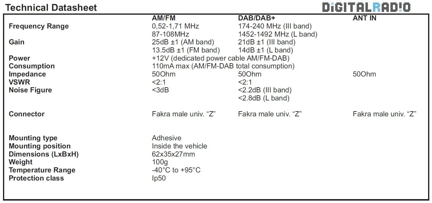 - FM=87,5-108MHz, 13,5 dB +/-1