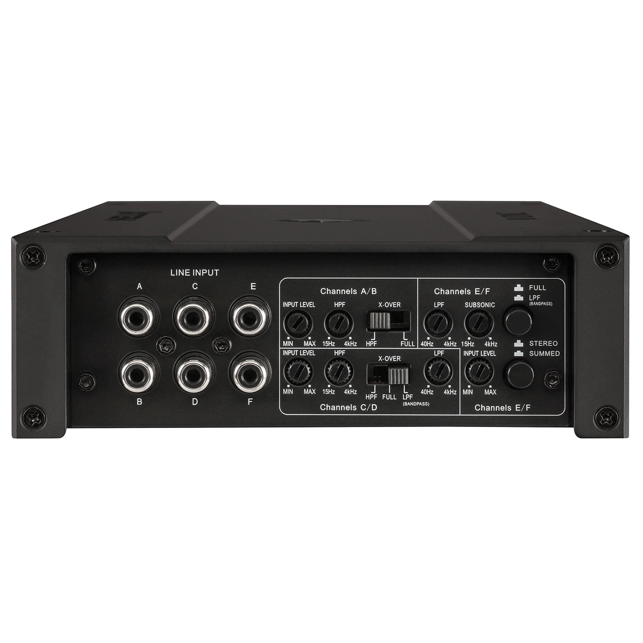 - Integrierte, aktive Frequenzweiche mit Hochpass, Tiefpass, Bandpass und Subsonic