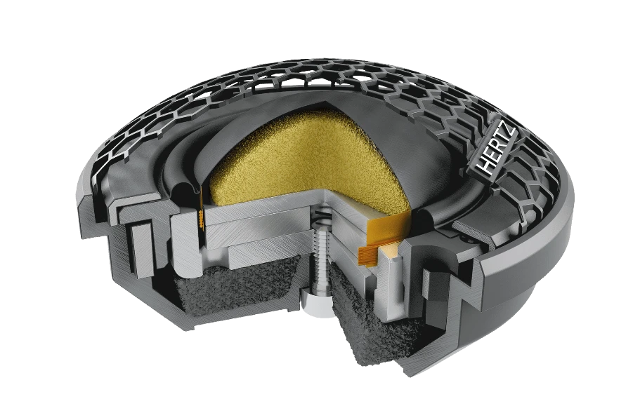 Die elektroakustischen Parameter des Tieftöners MP 165P.3 wurden geformt, um diesem den reinen und robusten Klang eines authentischen Midbass zu geben, der für hochdynamische Systeme entwickelt wurde. Die Schwingspule mit der großzügigen Höhe von 1,4 cm hat eine nominale Impedanz von 3 Ω, in Verbindung mit erhöhter Belastbarkeit. Diese Merkmale erlauben die maximale Ausnutzung der Kraft der Verstärker HCP und HDP von Hertz, sowie aller stabilen 2-Ω-Elektronik. Der 95-mm-Ferritmagnet ermöglicht eine lineare Membranauslenkung der Schwingspule von +/-4,5 mm, was jederzeit maximale Kontrolle gewährleistet. Der Boundary Free Surround bewegt eine größere Menge Luft, und das V-cone®-Profil verbessert das seitliche Abstrahlverhalten für beste Hörbedingungen im Auto. Der hochwertige Korb aus einer Aluminiumlegierung neutralisiert unerwünschte Vibrationen.