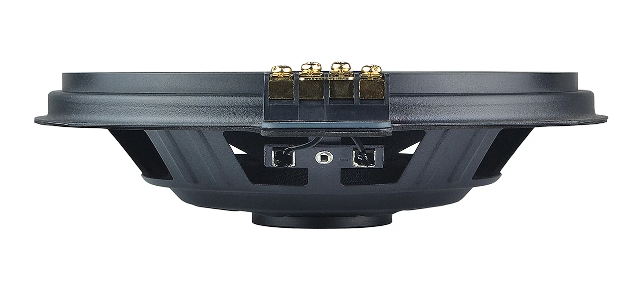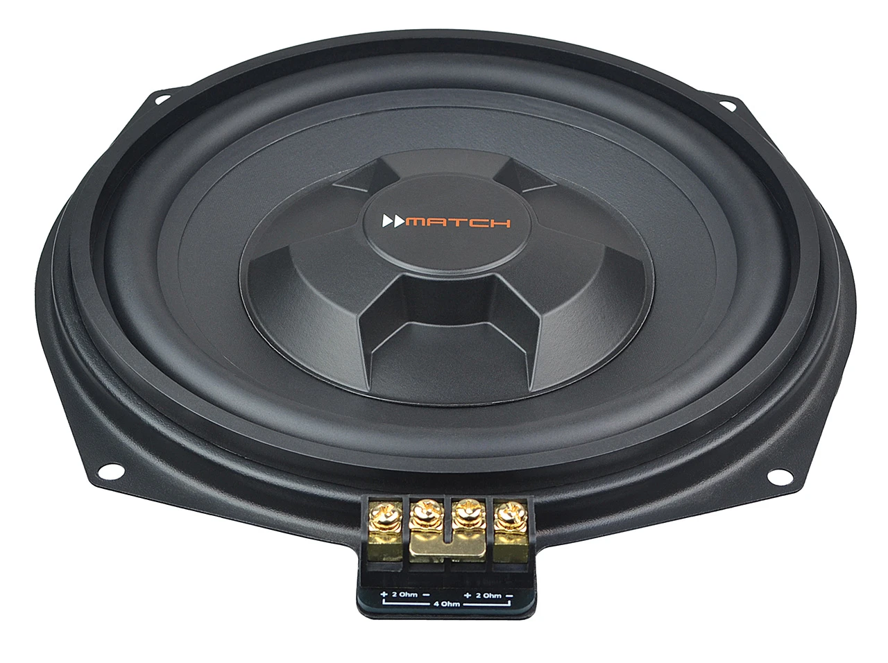 Aber auch für den universellen Einsatz bieten diese Subwoofer ideale Voraussetzungen. Die besonders geringe Einbautiefe ermöglicht die Verwendung in extrem kompakten, geschlossenen Gehäusen. Die überdimensionierte 42,5 mm große Schwingspule garantiert eine hohe Belastbarkeit. Des Weiteren erlaubt das spezielle Anschlussterminal mit seinen vergoldeten Schraubklemmen zwei verschiedene Konfigurationen und so flexibelste Anschlussmöglichkeiten. Ist die beiliegende Metallbrücke montiert, hat der Subwoofer eine Impedanz von 1 x 4 Ohm. Ohne Brücke kann jede Schwingspule einzeln angesteuert werden (Impedanz 2 x 2 Ohm) und ermöglicht somit eine optimale Anbindung an die MATCH Plug & Play Verstärker.