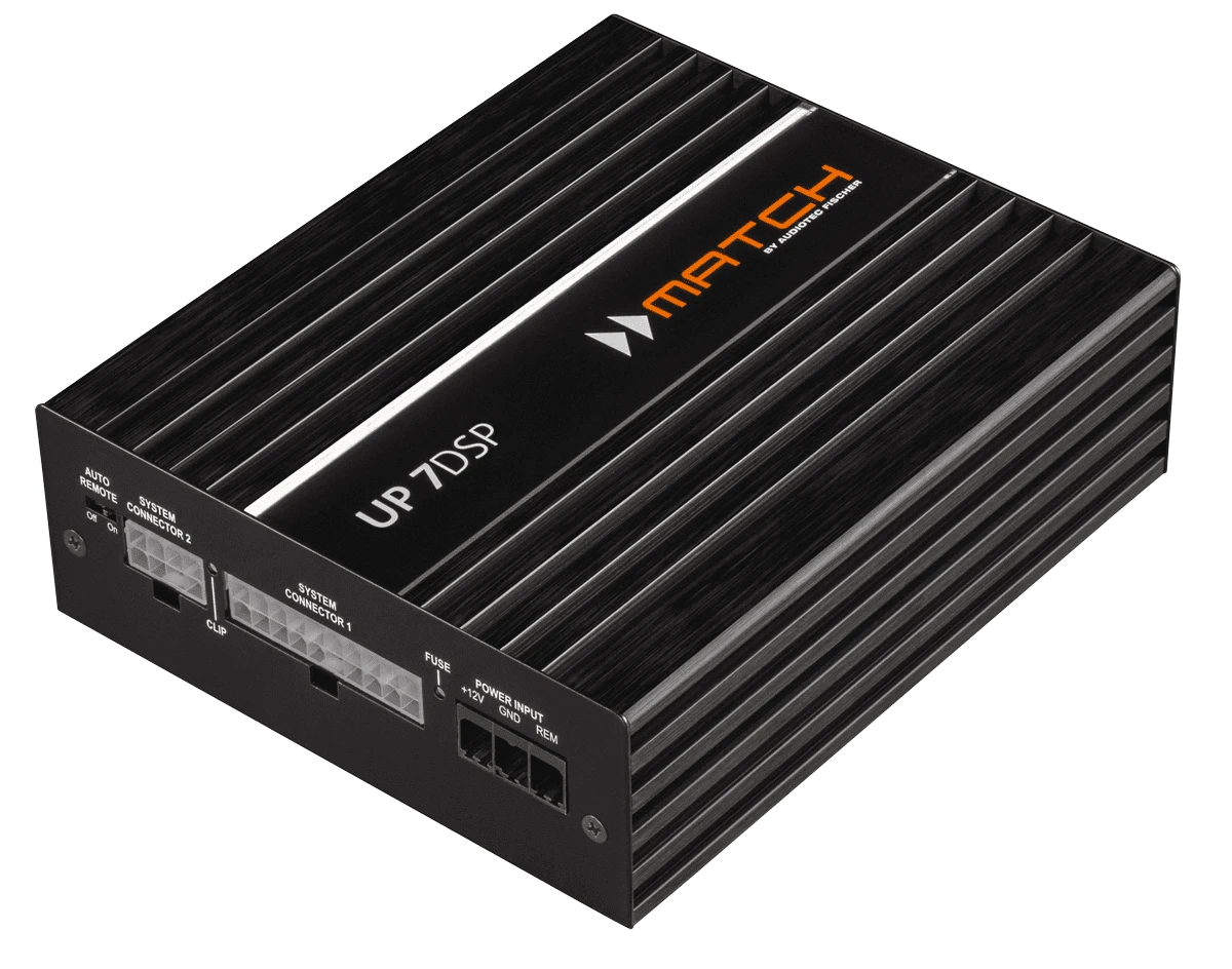 Die UP 7DSP ist die leistungskräftigste MATCH DSP Endstufe und verfügt über unseren neuen ADEP.3 Schaltkreis. Mit insgesamt 7 Verstärkerkanälen und zusätzlichem Vorverstärkerausgang lassen sich mit dem integrierten 8 Kanal DSP auch individuelle Lautsprecherkonfigurationen perfekt ansteuern. Zwei Endstufen-Kanäle liefern mit jeweils 160 W Sinusleistung an 2 Ohm mehr als genügend Power, um selbst großen Subwoofern mächtig einzuheizen.