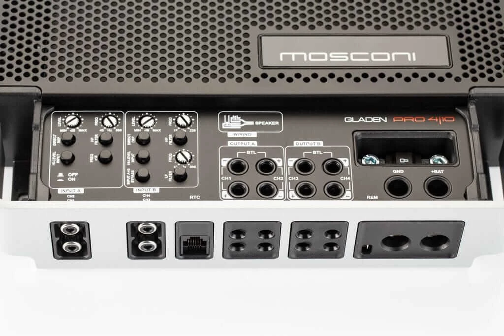 Die PRO 4|10 kommt mit vier Verstärkerkanälen –liefert 4x 120 Rms Watt reine Class A/B Leistung auf NEXT LEVEL Niveau. Die Integration getrennter aktiver Frequenzweichen für alle Kanäle garantiert maximale Flexibilität; alternativ können alle Weichen umgangen werden, um die Eingangsparameter für die Zusammenarbeit mit Mosconi DSPs anzupassen.