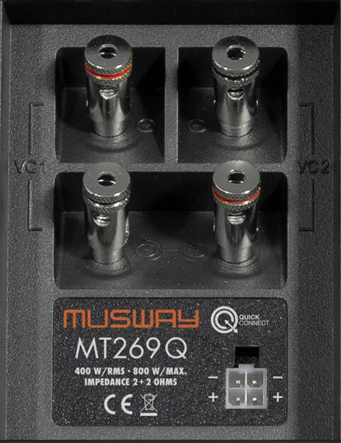 Die stabil konstruierten MDF-Gehäuse sind mit hochwertigem schwarzem Teppich bezogen und fügen sich harmonisch und dezent in jedes Fahrzeuginterieur ein. Weiterhin sind ohne Ausnahme alle Modelle mit QUICK CONNECT Anschlussbuchsen ausgestattet und können blitzschnell per optionalem Anschlusskabel beispielsweise an die MUSWAY M6 und deren QUICK CONNECT Port angeschlossen werden. Selbstverständlich können die MUSWAY Subwoofer-Systeme auch konventionell an herkömmliche Push-Pin Terminals angeschlossen werden.